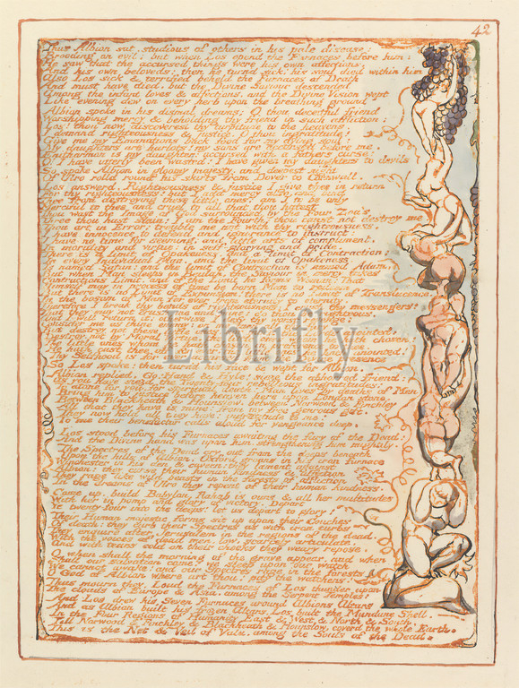 Jerusalem, Plate 42, Thus Albion sat..., Print, William Blake, 1757–1827, British, 1804, 1820, Relief etching printed, orange, pen, black ink, watercolor, moderately thick, smooth, cream wove paper, Sheet, Plate, fruit, grapes, leaf, literary theme, men, nudes, religious, mythological subject, text, vines, women