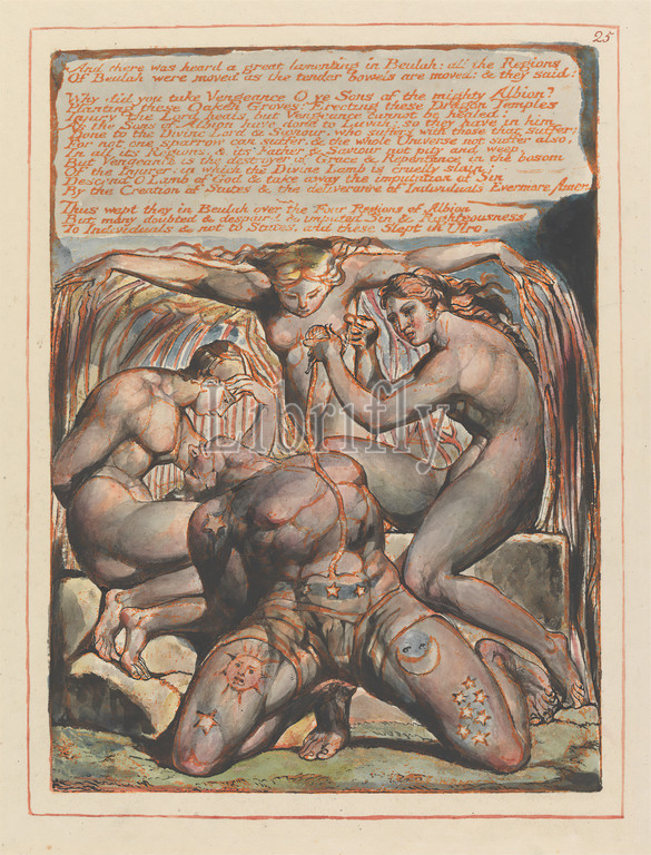 Jerusalem, Plate 25, heard..., Print, William Blake, 1757–1827, British, 1804, 1820, Relief etching printed, orange, pen, black ink, watercolor, gold, moderately thick, smooth, cream wove paper, Sheet, Plate, branches, intestines, literary theme, men, moon, nudes, religious, mythological subject, roots, stars, stone, sun, tears, text, women