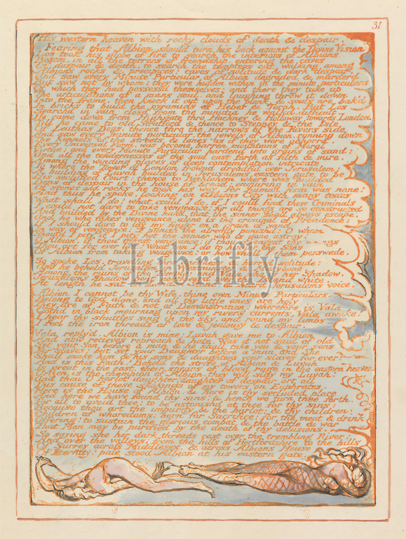 Jerusalem, Plate 31, western heaven..., Print, William Blake, 1757–1827, British, 1804, 1820, Relief etching printed, orange, pen, black ink, watercolor, moderately thick, smooth, cream wove paper, Sheet, Plate, clouds, literary theme, net, religious, mythological subject, text, thread, weaving, hand, women