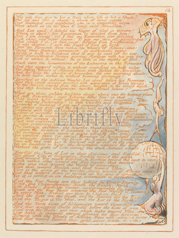 Jerusalem, Plate 12, Why wilt thou give, ..., Print, William Blake, 1757–1827, British, 1804, 1820, Relief etching printed, orange, pen, black ink, watercolor, moderately thick, smooth, cream wove paper, Sheet, Plate, clouds, compass, globe, gown, literary theme, men, planet, religious, mythological subject, sky, sphere, text, women