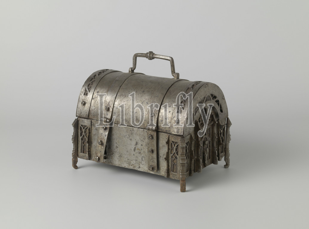 Jewelry case, iron, iron jewelry case, four legs, handle, arch-shaped lid, hidden lock, unfolded decorations, bishop's statue, c, 1400, 1500, metal