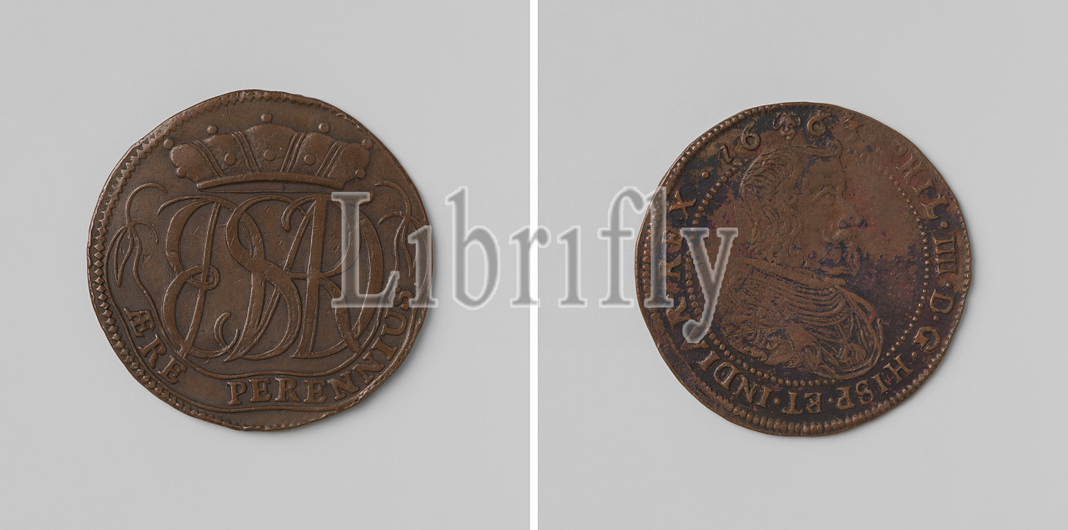 Jhr. E. Meyster, initiator of the drafting of the large boulder found in the city of Amersfoort in the Pisberg, Copper Medal. Front: crowned monogram above pennant with lettering. Reverse: statue of Minerva, standing on the big stone, inscription on a pennant in the background, Pisberg [BT: Amersfoort], Jonkheer Everard Meyster, anonymous, Netherlands, 1664, copper (metal), striking (metalworking), d 3.4 cm × w 7.21 gr