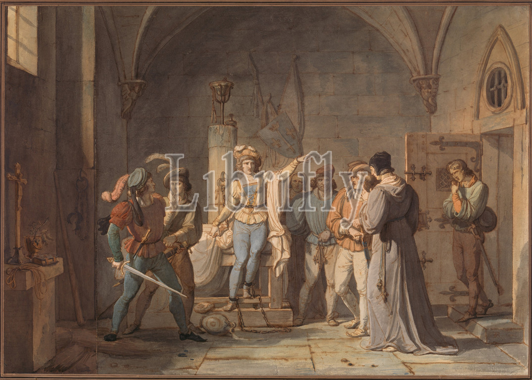 Joan, Arc Imprisoned, Rouen, 1819, Pen, brown ink, watercolor, wash, two sheets, laid paper, mounted together, sheet, 18 7/8 x 26 7/8, 48 68.2 cm, Drawings, Pierre Henri Revoil, French, Lyon, 1776–1842, Active, Paris, student, Jacques-Louis David, native Lyon, Revoil, leading proponent, Troubadour style, favored historicizing subjects, highly finished, study, painting Joan, Arc, Prison, Musée des, Beaux-Arts, exhibited, Salon
