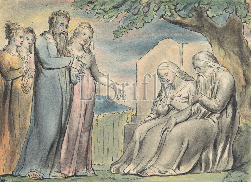 Job Accepting Charity, circle, John Linnell, 1792–1882, British, William Blake, 1757–1827, British, Watercolor, black ink, moderately thick, slightly textured, cream wove paper, Sheet, charity, helping, men, Old Testament, praying, religious, mythological subject, sitting, tree, women