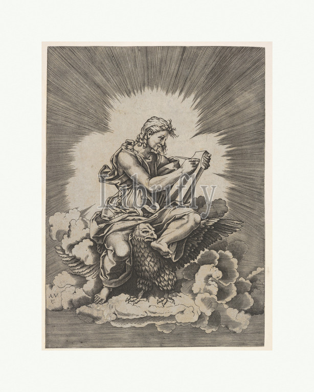 St, John, seated, holding, writing instrument, tablet, eagle, outstretched wings, legs, series, four evangelists, Agostino Veneziano, turn, Giulio Romano, 1518, Engraving, sheet, 9 1/2 x 6 15/16, 24.2 17.7 cm, Prints, Anonymous, Italian, 16th century, After Agostino dei Musi, Venice ca., 1490–after, 1536, Rome, Giulio, 1499?–1546, Mantua