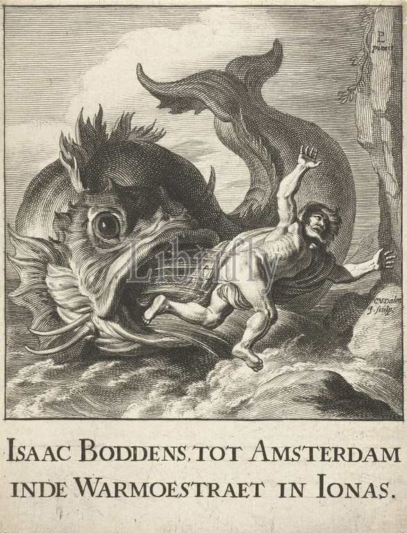 Jonas spit out, whale, thrown, shore, Jonas, lead role relates, person Isaac Boddens, mentioned, lower margin, working, Warmoestraat, Amsterdam, according, inscription, three-day sojourn, belly, monster, Jonah, shown nude, bald-headed, Cornelis van Dalen, II, object, 1648, 1664, paper, engraving