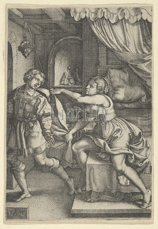 Joseph, Potiphar, Wife, Story, 1546, Engraving, Sheet, 4 5/8, 3 1/8, 11.7, 8 cm, Prints, Georg Pencz, German, Wroclaw ca., 1500–1550, Leipzig