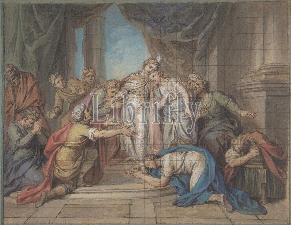 Joseph Recognized, Brothers, 18th century, Red, black chalk, watercolor, gouache, squared, pen, ink, 9 3/4 x 12 11/16, 24.8 32.2 cm, Drawings, Charles Antoine Coypel, French, Paris, 1694–1752