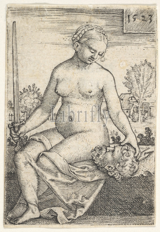 Judith, seated nude, sword, right hand, gazing down, head, Holofernes, left, 1523, Engraving, Sheet, 2 3/8 x 1 9/16, 6 4 cm, Prints, Barthel Beham, German, Nuremberg ca., 1502–1540, Italy