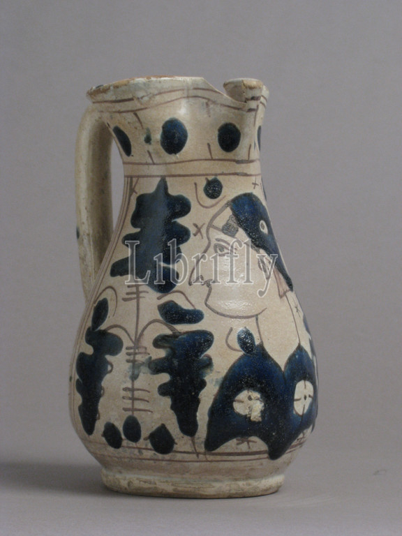 Jug with Figure in Profile, 1420–50, Made in Florence or its vicinity, Tuscany, Italy, Italian, Tin-glazed earthenware, Overall: 7 1/2 x 5 9/16 x 4 11/16 in. (19.1 x 14.2 x 11.9 cm), Ceramics, By the 1500s Italian maiolica makers would famously use the surface of their wares to depict complex narrative scenes, but this jug, with its confident half-length depiction of a man, represents an early foray into figure drawing by a Florentine potter