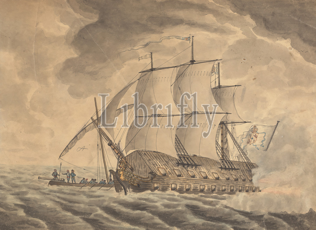Junk Ship Employed Against Gibralter..Single Junk Ship, Joseph Cartwright, c.1789–1829, British, 1782, Watercolor, pen and black ink, gray ink and graphite on medium, slightly textured, beige, wove paper, mounted on, moderately thick, slightly textured, beige, wove paper, Mount: 13 3/16 × 16 15/16 inches (33.5 × 43 cm) and Sheet: 9 7/8 × 13 9/16 inches (25.1 × 34.4 cm)