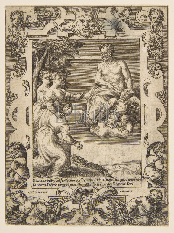 Juno, left asks Jupiter, help, Greeks, set within, elaborate frame, Loves, Rages, Jealousies, 1531–76, Engraving, sheet, 5 5/16 x 4 1/8, 13.5 10.5 cm, Prints, Giulio Bonasone, Italian, active Rome and Bologna, 1531–after, 1576