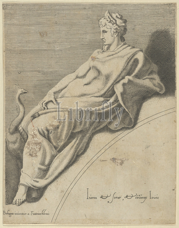 Juno (from The Muses and the Three Great Goddesses), 1540–56, Engraving, 8 7/8 x 6 15/16 in. (22.6 x 17.7 cm), Prints, Engraved by Anonymous, Italian, 16th century (Italian, active Central Italy, ca. 1550–1580), after Léon Davent (French, active 1540–56), after Francesco Primaticcio (Italian, Bologna 1504/5–1570 Paris)