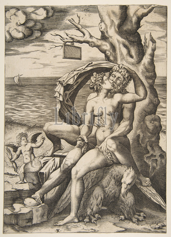 Jupiter, Semele embracing, eagle beneath, tree, right, blank tablet hanging, branch, winged putto holding, thunderbolt, left, ca, 1515–27, Engraving, Sheet, Trimmed, 11 1/8, 7 15/16, 28.2, 20.2 cm, Prints, Marco Dente, Italian, Ravenna, active by, 1515–died, 1527, Rome, After, Giulio Romano, 1499?–1546, Mantua