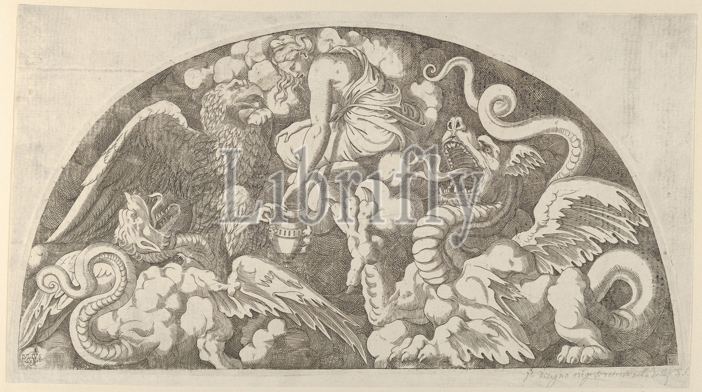 Jupiter, Eagle Bringing, Water, Styx, Psyche, 1540–56, Engraving, Sheet, 9, 16 1/4, 22.8, 41.2 cm, Prints, Léon Davent, French, active, After Giulio Romano, Italian, Rome, 1499?–1546, Mantua