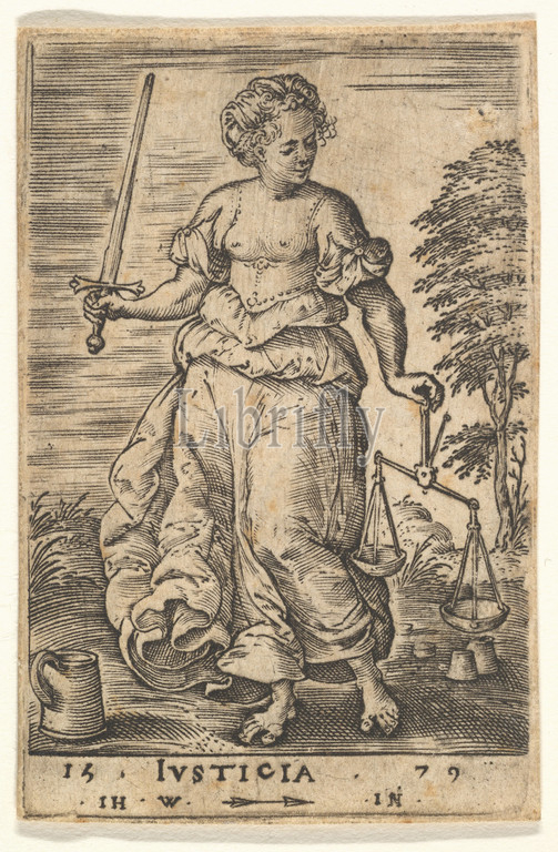 Justice, an allegorical figure holding a balance in her left hand and a sword in her right, from the series 'The Seven Virtues and Knowledge', 1579, Engraving, sheet: 2 5/16 x 1 9/16 in. (5.8 x 3.9 cm), Prints, Jan (Johannes) Wierix (Netherlandish, Antwerp 1549–1615 Brussels)