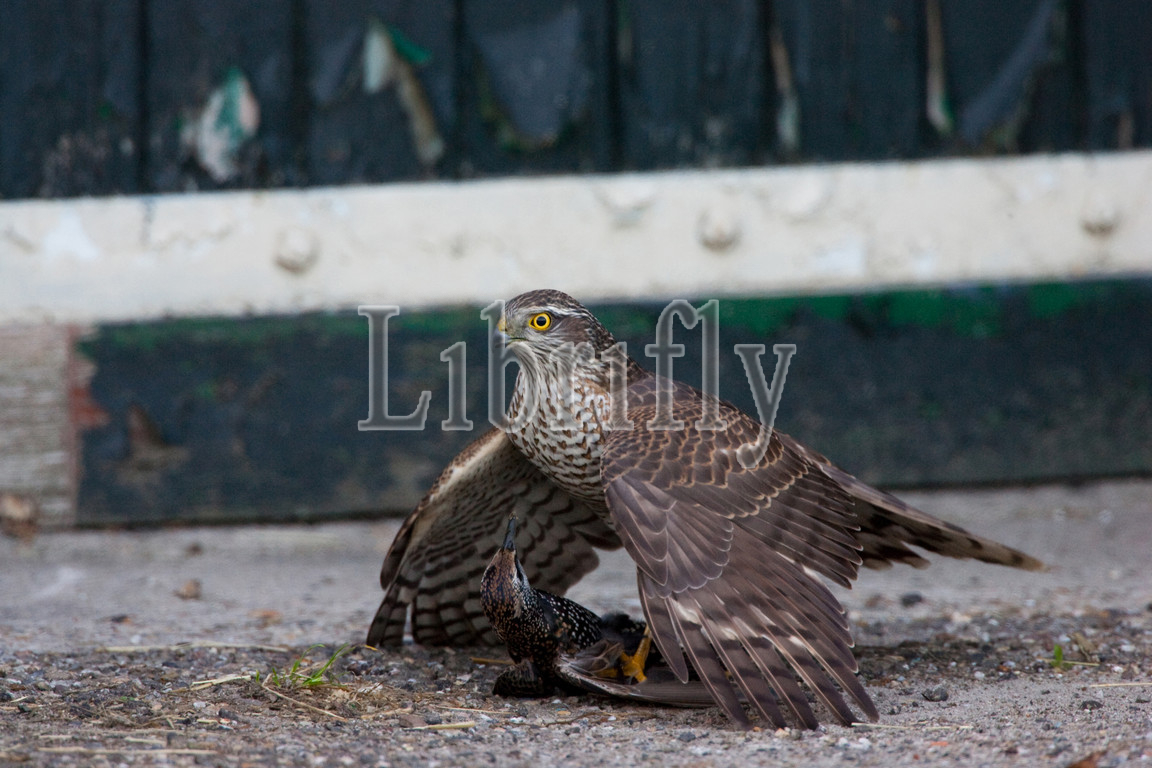 Juvenile Eurasian Sparrowhawk catching Starling, Accipiter nisus