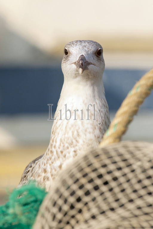 Juvenile Gull on fishing nets, Netherlands