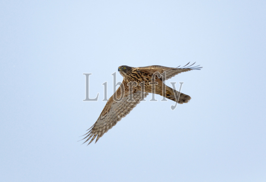 Juvenile Northern Goshaw flying against blue sky, Netherlands