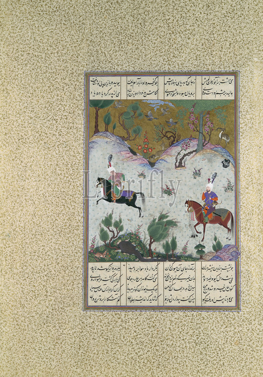 'Kai Khusrau Rides Bihzad for the First Time', Folio 212r from the Shahnama (Book of Kings) of Shah Tahmasp, ca. 1525–30, Made in Iran, Tabriz, Opaque watercolor, ink, silver, and gold on paper, Painting: H. 11 1/8 in. (28.2 cm), Codices, Painting attributed to Qasim ibn 'Ali (active ca. 1525–60), Giv and Kai Khusrau travel to Siyavushgird to tell Farangis their plans. They first need to find Bihzad, Siyavush's mount, who has been allowed to run wild in the mountains since his master's death. When they find Bihzad, the horse allows Kai Khusrau, who is carrying his old saddle, to put it on and mount