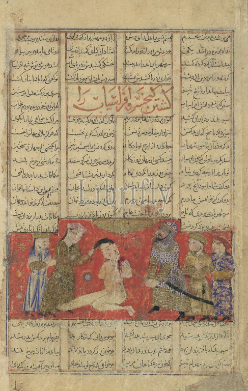 Kai Khusrau Slays Afrasiyab, Folio, Shahnama, Book, Kings, ca, 1330–40, Attributed, Iran, Isfahan, Ink, opaque watercolor, gold, silver, paper, Page, 8 1/16 x 5 3/16, 20.5 13.2 cm, Codices, long, wars, Turan, defeat, capture, Turanian king, Afrasiyab, execution, Khusrau, Iranian shah, thus avenged, murder, father, Siyavush