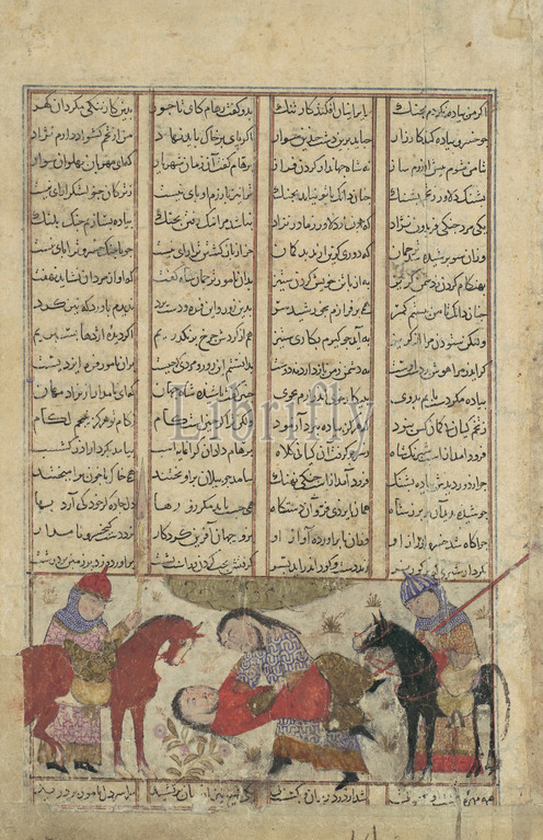 Kai Khusrau Wrestles, Shida, Folio, Shahnama, Book, Kings, ca, 1330–40, Attributed, Iran, Isfahan, Ink, opaque watercolor, gold, silver, paper, Page, 8 x 5 1/4, 20.3 13.3 cm, Codices, wrestling, match, final phase, single combat, encounters, case, prince gambled, reigning Shah, risk, indignity, foot, Khusrau, thinking, loss, Iranian warriors, hands, felt compelled, dash, ground, ending, life
