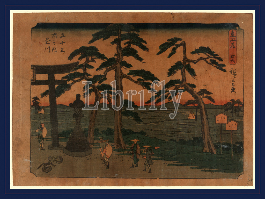1797-1858, 18.4, 1848, 1854, 25.6, Ando, Hiroshige, Kakegawa, Road, Tokaido, artist, color, pausing, print, shows, station, statue, torii, travelers, woodcut