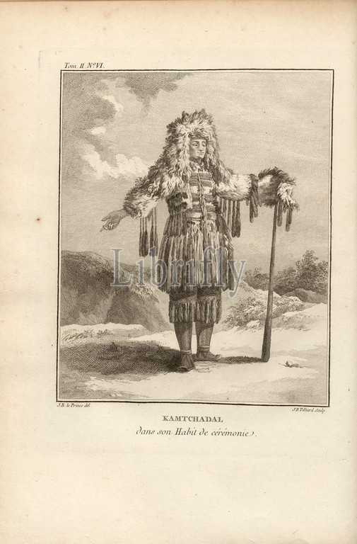 Kamchadal in his ceremonial dress, A Kamtschadale in his dresses for festivals, ceremonies, Signed: J. B. le Prince (del.), J. B. Tilliard (sculp.), Copperplate engraving, no. VI, after p. 38 (vol. 2), Le Prince, Jean-Baptiste ; Tilliard, Jean-Baptiste, 1768, M. Kracheninnikow: Voyage en Sibérie, contenant la description du Kamtchatka, ou l'on trouve. Paris: chez Debure, 1768.