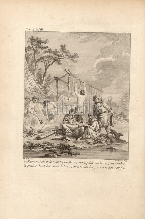 Kamchadals prepare, fish, drying, melt, fat, wooden vases, means, stones reddened, fire, Kamchadals prepare, fish, dry, melt, fat using stones heated, fire, Signed, J. B. le Prince, del., J. B. Tilliard, sculp., Copper engraving, no. III, according, p. 34, vol. 2, Le Prince, Jean-Baptiste, Tilliard, 1768, M, Kracheninnikow, Voyage en Sibérie, contenant la description du Kamtchatka, ou l' trouve, Paris, chez Debure, 1768