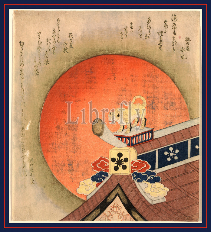 18.3, 1830., 20.7, Kawarayane, Tiger, color, edge, mounted, no, okimono, peak, print, roof, roof., shows, statue, tile, tora, woodcut