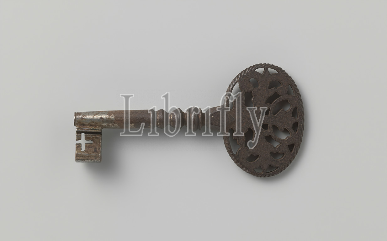Key, oval handle, Tinned iron key, handle, oval, cut away, abstracted flower, tendril motifs, Via three nodi, connected, key, hollow, inside, West-Europa, 1746, iron, metal, tin, engraving