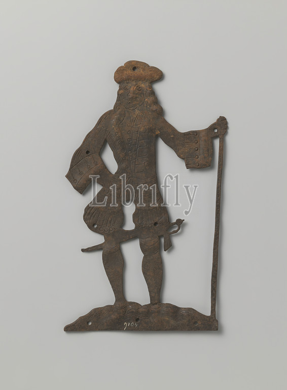 Key plate in the shape of a man, Key plate of iron in the shape of a man. The man with long, loose hair wears a headdress. His jacket has wide cuffs and a double row of buttons on his lapel. Underneath he wears shorts and shoes with a small heel. He holds a stick in his left hand. A sword or saber can be seen behind his knees. The opening of the keyhole is arranged between the upper legs., anonymous, West-Europa, 1675 - 1725, iron (metal), engraving, h 23.9 cm × w 13.7 cm
