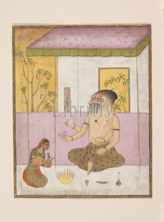 Khambhavati Ragini, Folio, ragamala series, Garland, Musical Modes, ca, 1675, India, Rajasthan, Bikaner, Ink, opaque watercolor, gold, paper, 6 1/4 x 5, 15.9 12.7 cm, Paintings, female mendicant makes, Vedic fire, offering, god Brahma, represented, four overlapping, faces, holds, text, rosary, mala, flower, earlier ragamala, 1550 provides, following description, Brahma, teaches, Vedas