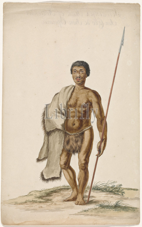 Khoikhoiman, assegaai, Black man dressed, white animal skin labia, inverted sheepskin, right shoulder, left hand, carries, javelin spear, Striking, thin beard, mustache, takeover, hairstyle, Dutch, Cape Colony, Africans, Cape, Good Hope, Netherlands, c, 1675, 1725, paper, watercolor, paint