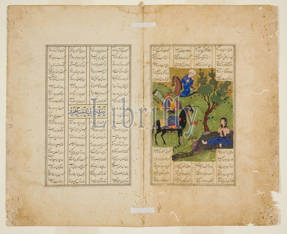 Khusrau Gazing at Shirin, from a copy of the Khamsa of Nizami, 1485 (890 A.H.), Iran, Iran, Opaque watercolor on paper, 28.1 x 34.7 cm (11 1/16 x 13 1/4 in.), left page width: 17.4 cm (6 7/8 in.), right page width: 17.3 cm (6 13/16 in.)