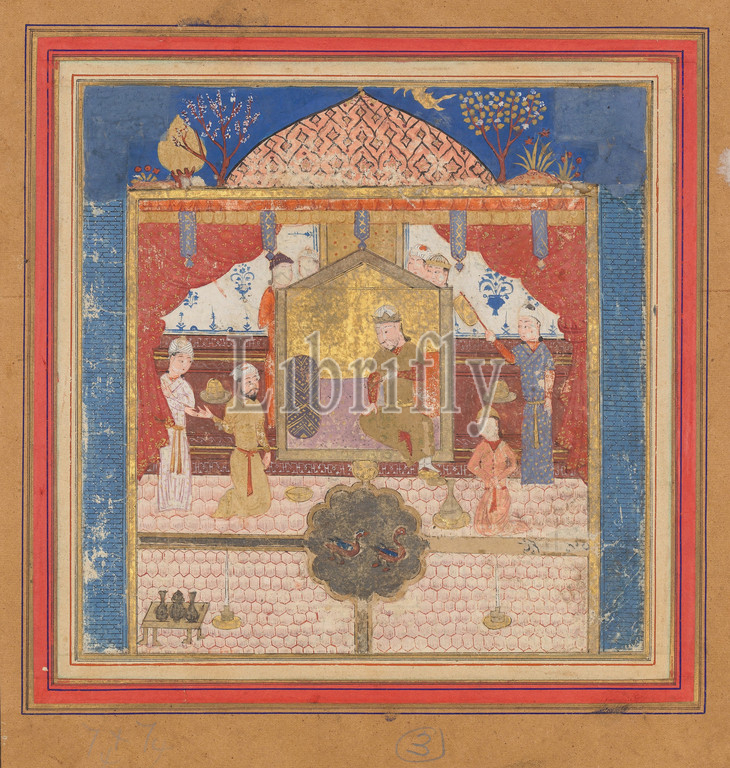 'Khusrau Parviz before his Father Hurmuzd (?)', Folio from a Shahnama (Book of Kings), ca. 1430–40, Attributed to India, Ink, opaque watercolor, and gold on paper, 8.37 in. high (21.3 cm high), Codices, This painting and the two next to it come from the same copy of a highly Persianate Shahnama that was probably made in northern India. The paintings from this book were later placed in an album with brightly colored borders