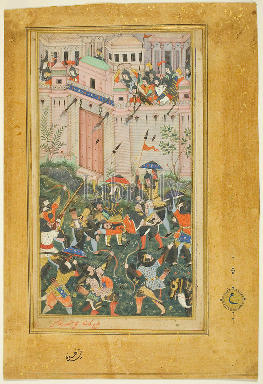 Kichik Beg Wounded, Babur's Attack, Qalat, page, copy, Baburnama, Book, Babur, c. 1590, India, Mughal period, Designed, Kanha, fl. c.1580-early 1590s, painted, Mansur, fl. c.1590-1630, Opaque watercolor, gold, paper, Image, 23.9