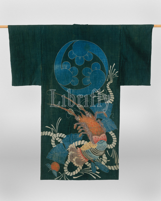 Kimono-Shaped Coverlet (Yogi) with Lobster and Crest, 紺木綿地海老模様夜着, Meiji period (1868–1912), mid-19th century, Japan, Plain-weave cotton, resist-dyed and painted with dyes and pigments (tsutsugaki), Overall: 67 x 58 1/4 in. (170.2 x 148 cm), Textiles-Costumes, Tsutsugaki, or “tube drawing,” is a freehand method of resist dyeing. For this technique, the artist first draws directly onto the cotton fabric by squeezing rice paste from a tube (tsutsu), similar to a pastry bag, and then dips the textile into indigo dye
