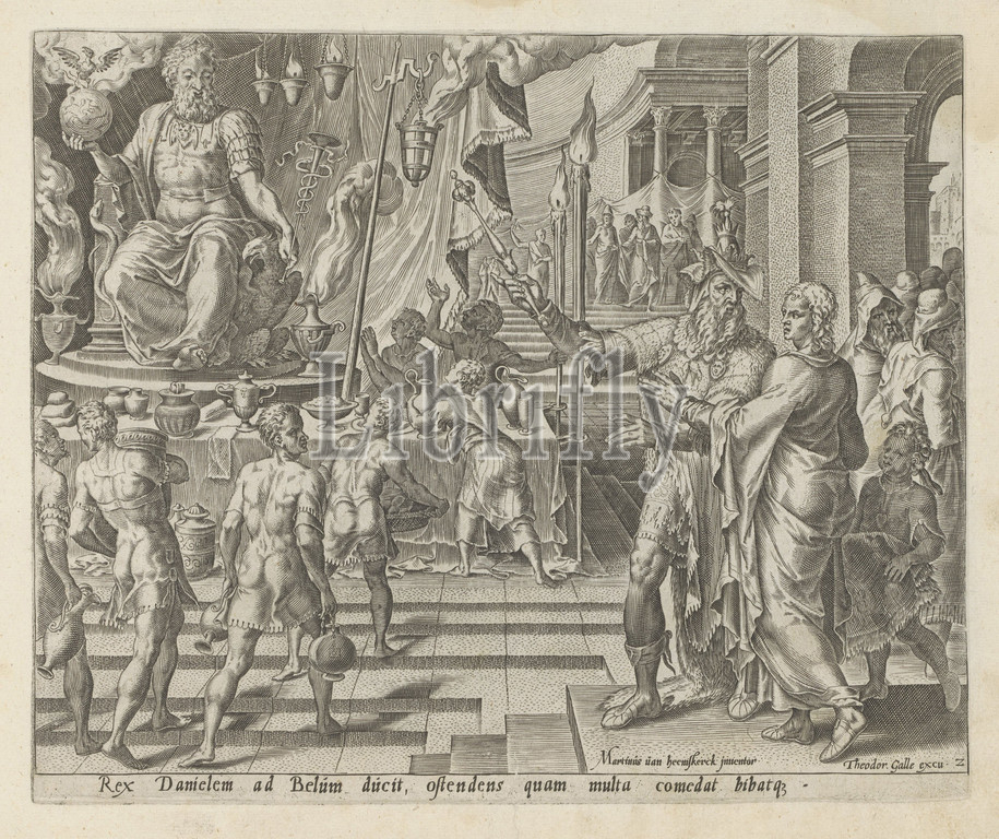 King Cyrus shows Daniel the statue of the god Bel Van den Bel and den Draeck in Babel (series title) History of Daniel, Bel and the dragon (series title) Den Grooten Figuer-Bibel (...) (series title), King Cyrus shows Daniel the temple of the god Bel. In the center of the temple is a large statue of the seated deity. Around it are vases with incense. Servants are busy displaying food and drinks on a table in front of the statue. Under the representation an explanatory text in Latin. Print is part of an album, King Cyrus sets food before the image of Bel, Daniel and his servants strew ashes on the floor of the temple, Philips Galle, 1565 and/or 1646, paper, engraving, h 204 mm × w 248 mm