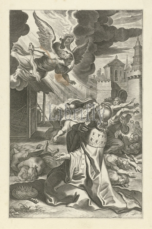 King David sees, angel, death Scenes, Old, New Testament, series title, Breviarium romanum, flaming sword attacks people, heaven, Kneeling King David sees, angel sowing death, destruction, people, Israel, begs God, mercy, print, part, series, scenes, David sees, avenging angel, Jerusalem, prays, God, Theodoor Galle, Antwerp, c, 1612, 1616, paper, engraving, w 194 mm × h 299 mm
