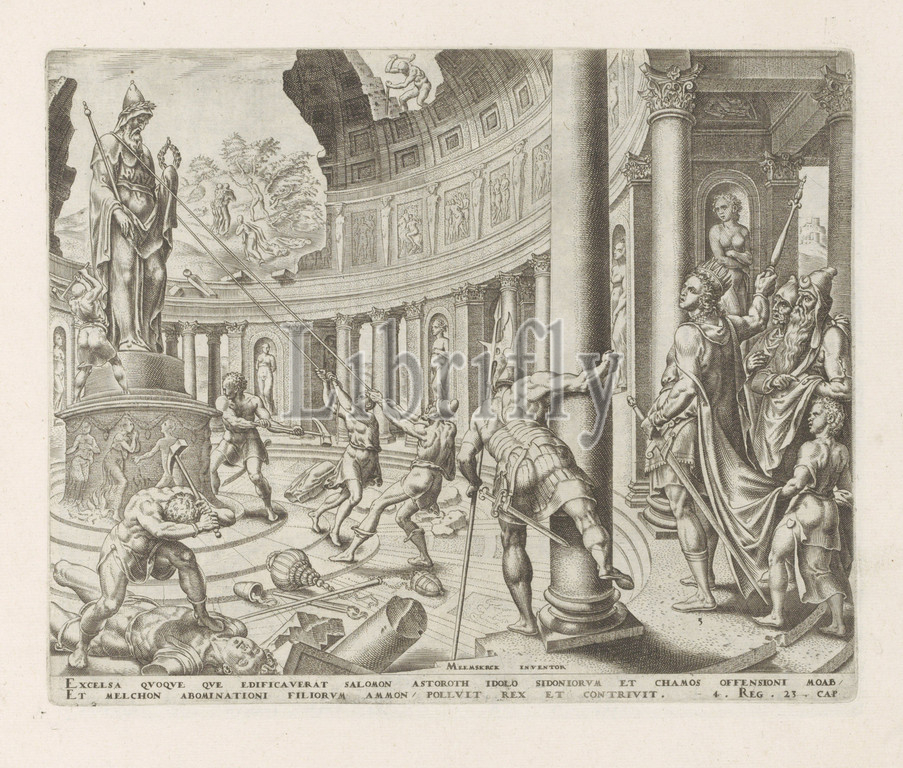 King Josia destroyed, temples, Astarte, Kemos, Milkom History, King Josia, series title, Thesaurus sacrarum historiaru, m, veteris testame, n, ti, elega, tissimis imaginibus expressu, excelle, tissimoru, hac arte viroru, opera, now, c primu, luce, editus, King Josiah leaves, honor, pagan gods Astarte, Milkom, destroy, images, idols, Two men, busy pulling, large statue, pedestal, men smash, temple, pieces, hammers, performance, reference, Latin, Bible text, 2 Kon, 23, 14, Print, part, album, pagan shrines, entire kingdom, desecrated, destroyed, story, Josiah, Philips Galle, 1567, 1571, 1579, paper, engraving