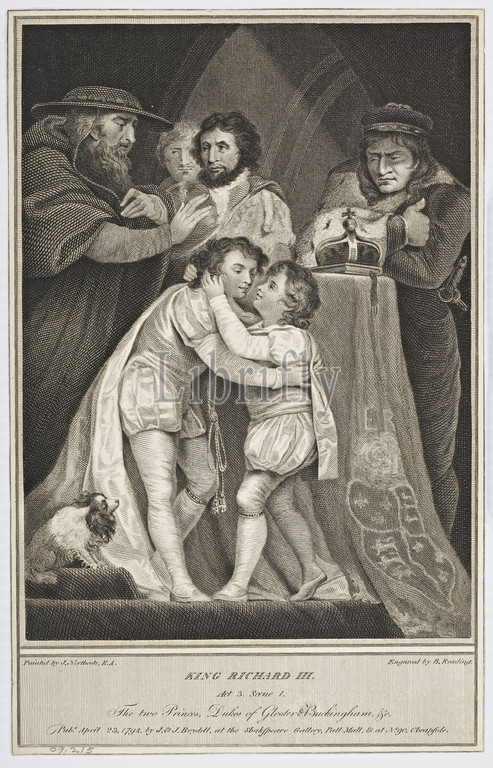 King Richard III, Burnet Reading (English), After James Northcote, 1798, ink on paper, engraving, 8-3/4 x 6-1/2 in. (image) 10-5/8 x 6-3/4 in. (sheet), Inscribed on plate: Painted by J. Northcote, R.A. Engraved by B. Reading King Richard III Act 3 Scene 1. The two princes Dukes of Gloucester and Buckingham &c.; Cheapside. Pub. Apr.23, 1798, by J.J. Boydell, at the Shakespeare Gallery. Pall Mall, E. etc.