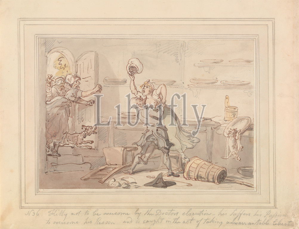 Kitty Overcome, Thomas Rowlandson, 1756–1827, British, 1821, Watercolor, pen, red-brown, brown ink, graphite, pen, gray ink, wash line, border, medium, slightly textured, cream, wove paper, Sheet, Mount, cat, domestic cat, chair, churn, dishes, dog, animal, door, elderly, genre subject, man, mouse, shelves, steps, Table, mixing, women, youth