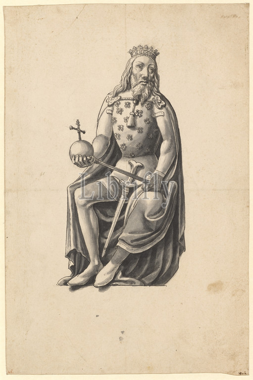 Kopie der Statue Rudolfs von Habsburg im Seidenhof, Feder in Schwarz, grau laviert, Blatt: 32.1 x 21.6 cm, U. l. mit Rötel nummeriert: 46; u. r. mit Feder in Braun signiert: HBock. [HB lig.], Hans Bock d. Ä., Zabern/Elsass um 1550/52–1624 Basel