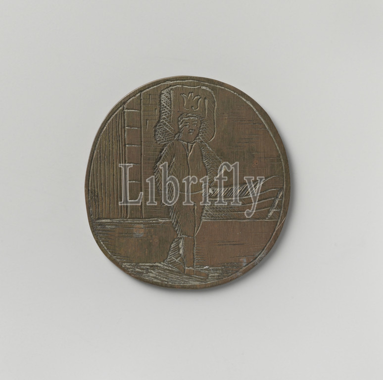 Korendragers- and-dumpersgild from Amsterdam, guild token from Cs. Ct. Trestle, Copper Medal. Front: Slightly turned to the right with load on head, on background: light barge and gate. Reverse: inscription, Amsterdam, Cs. Ct. Trestle, anonymous, 1796, copper (metal), engraving, d 2.9 cm × w 4.96 gr