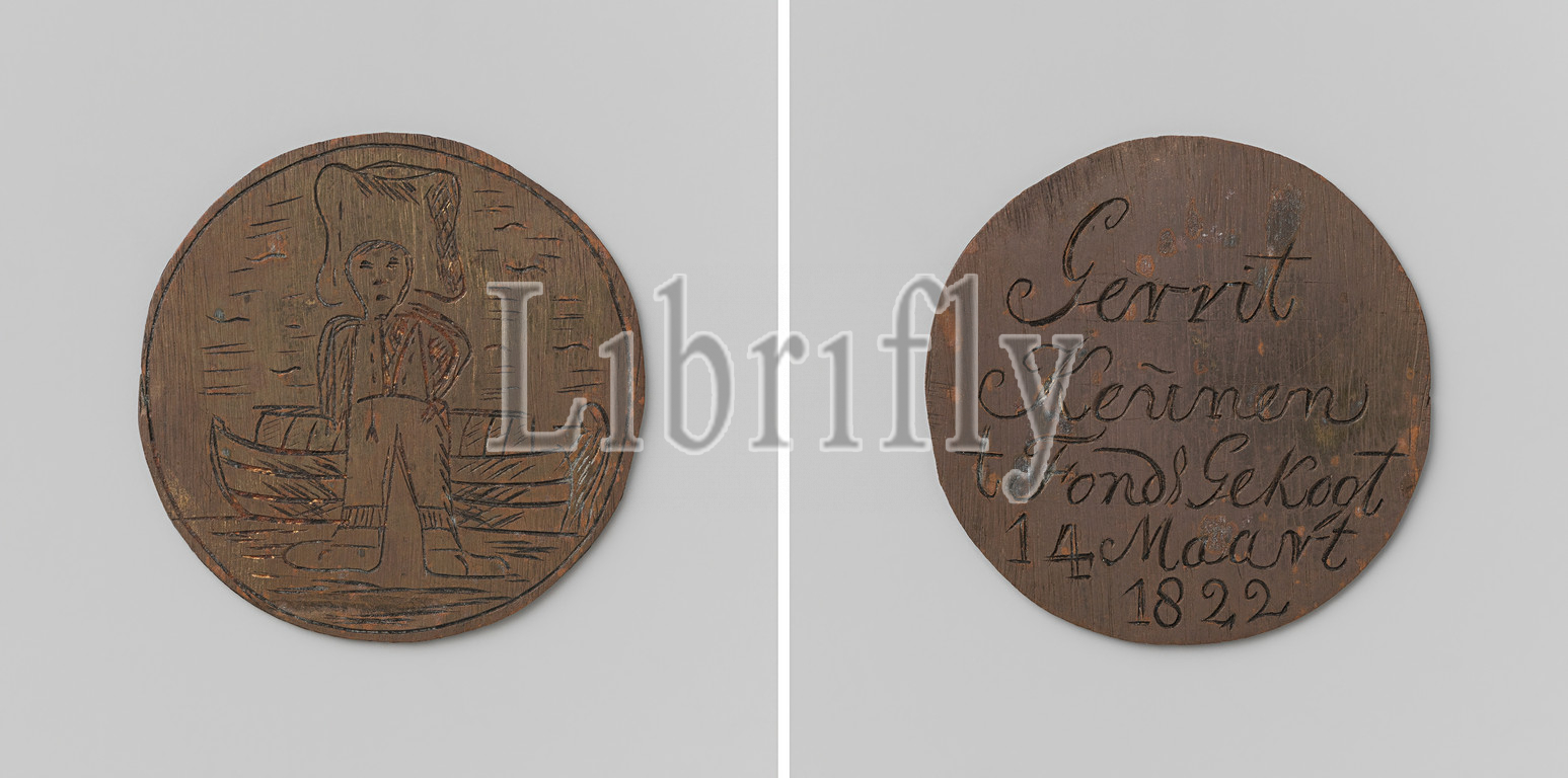 Korendragers-and-dumpingers guild, Amsterdam, guild token, Gerrit Keunen, Copper medal Front, man, load, head, face, standing, front, light barge, Reverse, inscription, 1822, copper, metal, engraving