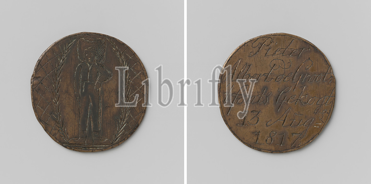 Korendragers-and-dumpingers guild, Amsterdam, guild token, Pieter Albert de Groot, Copper medal, Front side, man, head, face load inside leaf wreath, background, shaded, Reverse, inscription, 1817, copper, metal, engraving