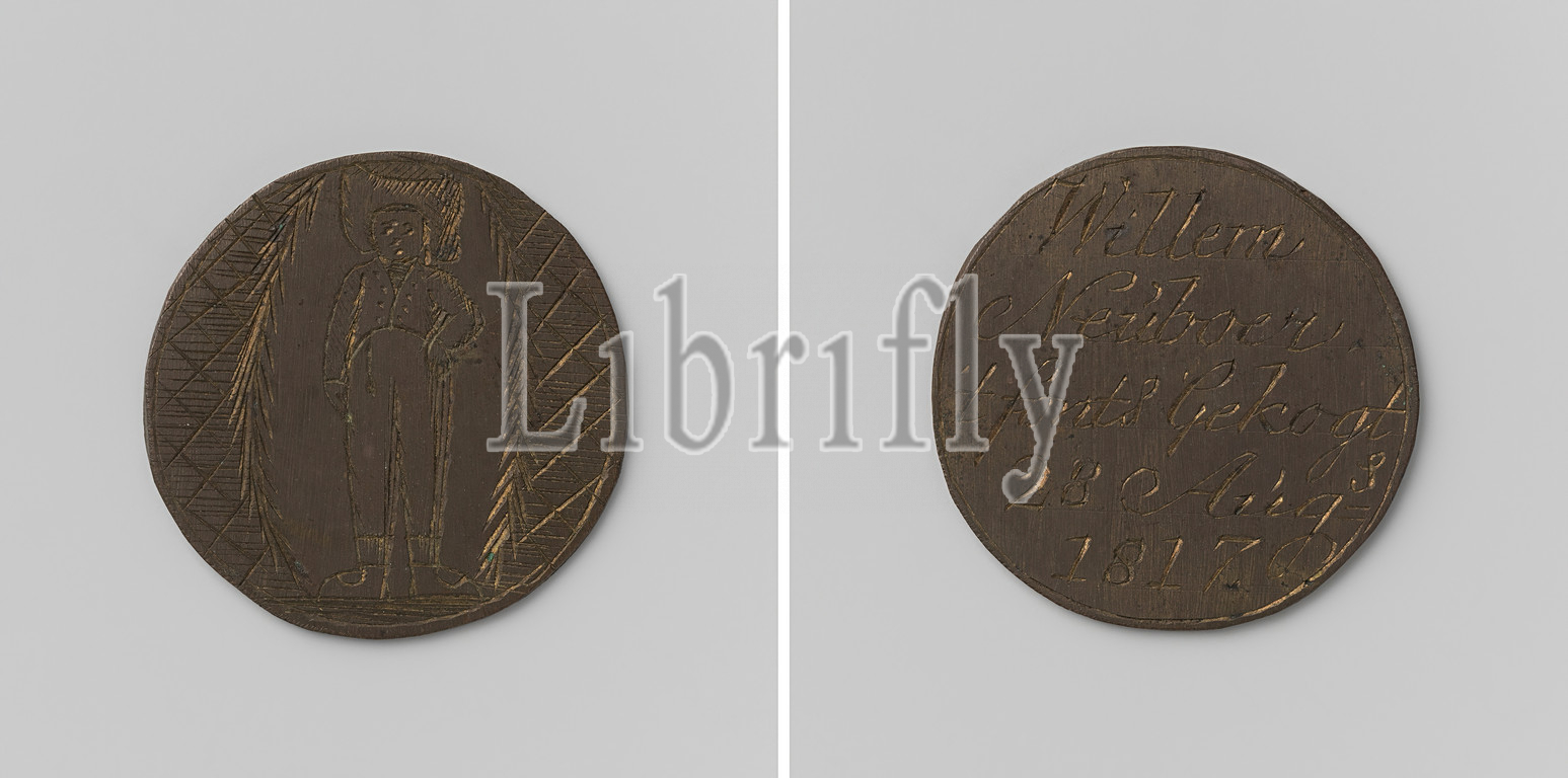 Korendragers- and-dumpingers guild of Amsterdam, guild token of Willem Neuboer, Brass medal. Front side: man with head and face load inside leaf wreath, background: shaded. Reverse: inscription, Amsterdam, Willem Neuboer, anonymous, 1817, brass (alloy), engraving, d 3.4 cm × w 97 gr