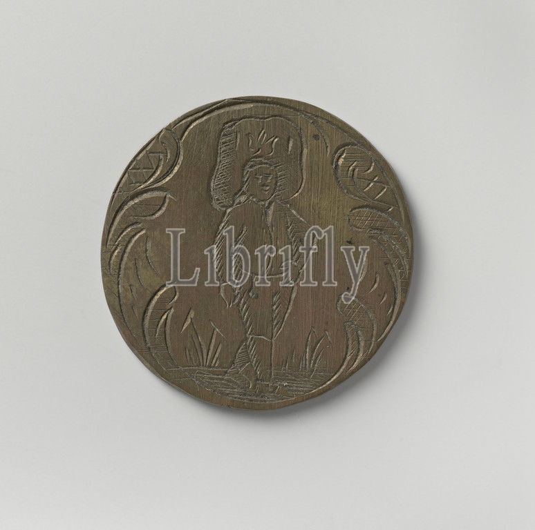 Korendragers- and-pourers guild of Amsterdam, Guild Medal of Pieter Keyser, Brass Medal. Front: Slightly turned to the right with load on head within decorative edge. Reverse: inscription, Amsterdam, Pieter Keyser, anonymous, 1797, brass (alloy), engraving, d 3 cm × w 8.79 gr