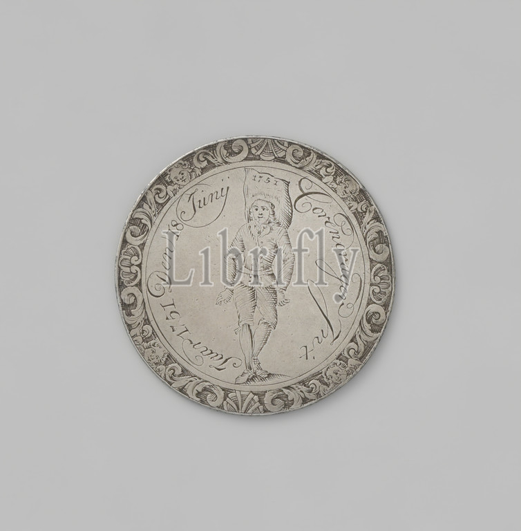 Korenlichtermans guild of Amsterdam, guild token of Evert de Milde, also a member of the grain bearers and dumpers guild, Silver Medal. Front: corn lighter, on which two men work under inscription and radiant sun within inscription and decorative border. Reverse: grain carrier with a pocket on the back, with the year inside the cover and decorative border, Amsterdam, Evert de Milde, anonymous, 1749 - 1751, silver (metal), engraving, d 4 cm × w 17.15 gr